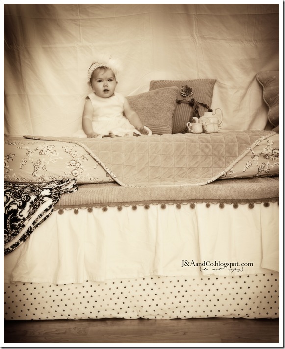 So, so cute! My fave is the one where she is playing with the tea cups and you can see the whole bed. I love all the ruffles. It makes me want to get on the bed and play with her. She is precious. I started laughing picturing her laughing after every lick of her sucker. Cute!